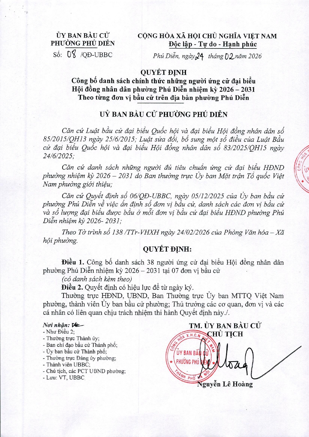 Quyết định công bố danh sách ứng cử đại biểu HĐND phường Phú Diễn nhiệm kỳ 2026-2031Đơn vị bầu cử số 01